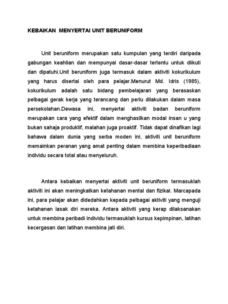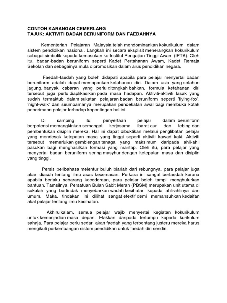 November 2012 faedah menyertai program motivasi di sekolah. Beberapa kes kematian dicatatkan disebabkan bermain sukan pada waktu malam. Lazimnya, pasukan beruniform akan menganjurkan pelbagai kegiatan tahan lasak atau kegiatan di luar sekolah. Kebaikan menyertai sukan air (bhgn a spm jun 2020). Panjang huraian hendaklah antara 200 hingga 250 patah perkataan.
