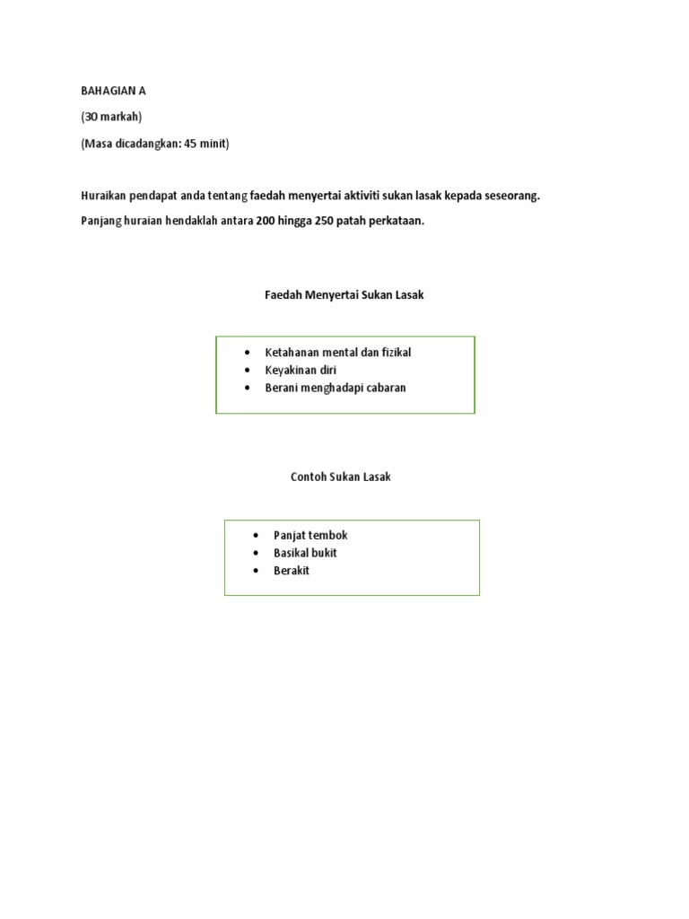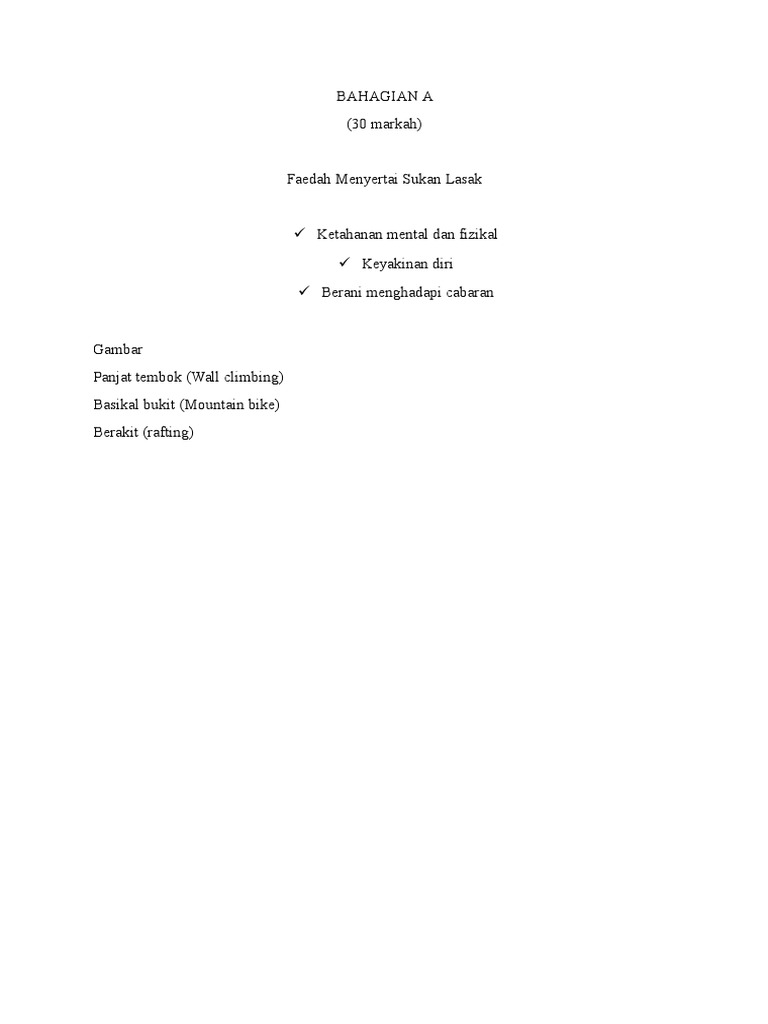 Kelab sukan lasak dun kubu gajah akan ditubuhkan bagi mengembangkan lagi sukan itu di kalangan penduduk luar bandar. Panjang huraian hendaklah antara 200 hingga 250 patah perkataan. Karangan faedah menyertai aktiviti sukan lasak spm. Salah satu faedah memperkenalkan sukan lasak seperti kembara, mendaki gunung, berkayak, dan lumba basikal di peringkat sekolah ialah kita dapat oleh itu, mulai tahun 2004, program latihan khidmat negara diperkenalkan dan pelajar lepasan spm diwajibkan menyertai program ini secara. Harian metro 1 year ago.