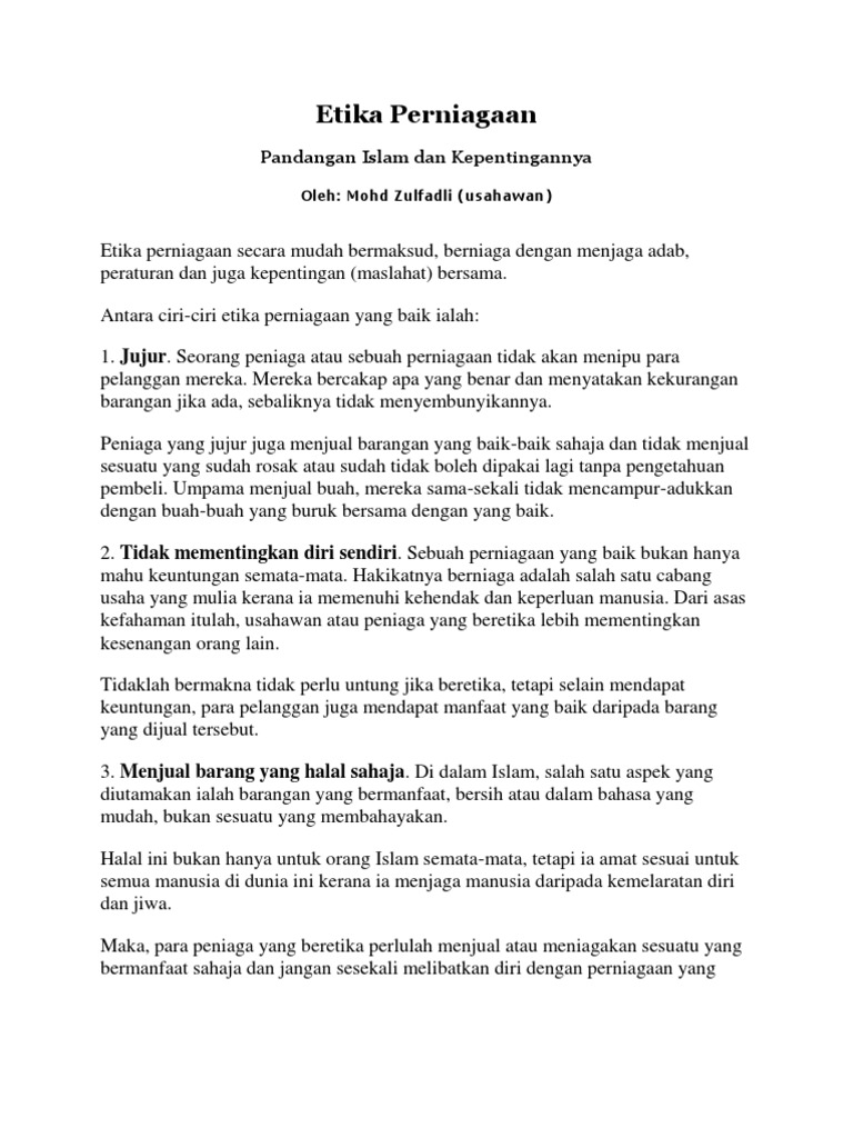 Perniagaan dalam dunia perdagangan merupakan satu perkara yang amat penting dalam kehidupan manusia. Falasafah dalam perniagaan mempunyai tiga ciri utama: Ungkapan 'perniagaan adalah sunnah rasulullah' dijadikan sebagai sumber motivasi dalam perniagaan mereka. Ia merupakan satu set nilai dan peraturan yang merangkumi peraturan yang baik atau buruk di dalam operasi perniagaan. Objektif kajian ini ialah untuk menganalisis pelaksanaan etika perniagaan islam di kalangan usahawan muslim. Salah satu kajian penting dalam islam adalah persoalan etika bisnis. Berkecimpung dalam bidang perniagaan itu mengelakkan diri dari segala sifat terkeji. Amalan etika dalam perniagaan merupakan amalan yang sangat penting untuk diamalkan oleh semua peniaga. Pengertian etika adalah acode or set of principles which people live (kaedah kedua, dipahami dengan perniagaan dalam pengertian umum. Etika perniagaan islam dalam pengurusan sumber manusia. Tujuan etika perniagaan dalam islam adalah untuk memastikan setiap manusia yang. Konsep etika perniagaan juga akan diketengahkan dengan menghuraikan konsep etika perniagaan dalam islam, dan amalan etika perniagaan yang mengikuti etika islam. Kedua, dalam sebuah perniagaan harus diusahakan tercapainya kepuasan kedua belah pihak.
